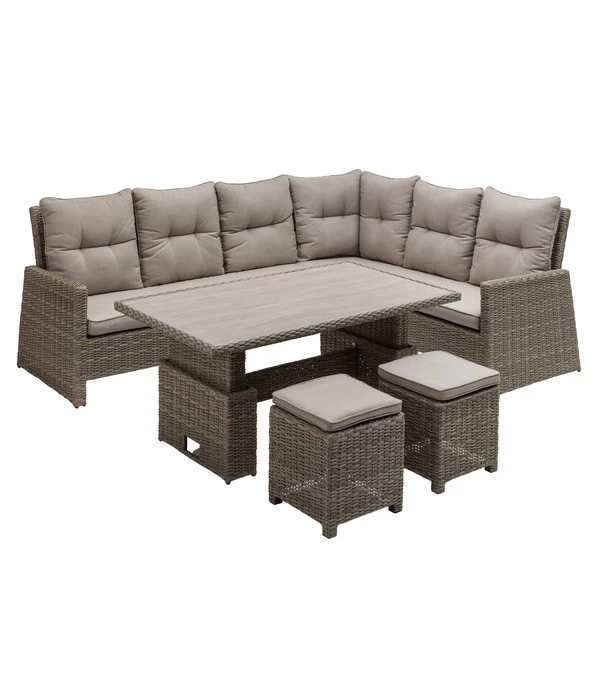 Es gibt Einladungen, denen man einfach nicht widerstehen kann. Und in diesem Fall müssen Sie es auch gar nicht. Denn, wenn erst einmal eine Dehner Geflechtlounge Bologna bei Ihnen auf der Terrasse steht, sollten Sie sich das gönnen so oft Sie nur können! Sinken Sie in die bequemen Polster, legen Sie die Füße hoch und blicken Sie mal in die eine, mal in die andere Richtung in Ihrer grünen Oase. Denn Sie sind jetzt der stolze Besitzer einer großzügigen Outdoor-Lounge, die wirklich keine Wünsche offenlässt. Das gilt bei 7 Sitzplätzen natürlich auch für gesellige Runden, die so gemütlich sein werden, dass Ihre Gäste gar nicht wieder aufstehen wollen. Eine Tatsache, zu der der attraktive Tisch einen gehörigen Teil beiträgt. Schließlich bietet er ausreichend Fläche für Ihren Sommerkuchen, das Kaffeegeschirr und einen üppigen Blumenstrauß. Oder Sie lassen es sich abends bei einer Familienrunde zum Grillen gutgehen. Kurzum: Sobald Sie die Dehner Geflechtlounge Bologna gesehen haben, können Sie sich Ihre Terrasse nicht mehr ohne sie vorstellen!