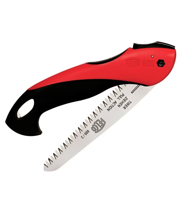 Oft ist beim Arbeiten im Garten nur eine Hand frei. Besonders dann ist die Felco Klappsäge 600 Ihr unentbehrlicher Begleiter, denn mit nur einem Knopfdruck löst sich das ähnlich wie ein Taschenmesser ausklappbare Sägeblatt aus dem Griff. Das Sägeblatt der Felco Klappsäge 600 hat eine Länge von 16 Zentimetern, die Säge wiegt leichte 160 Gramm und hat eine Gesamtlänge von 35 Zentimetern. Bei ausgeklappter Säge ist der Mechanismus arretiert, was der Verletzungsgefahr vorbeugt. Wie bei Felco üblich sind die Teile bei Verschleiß ersetz- und austauschbar. Die konische Form des Sägeblattes verhindert, dass die Säge blockiert. Die besondere Form und Stellung der Zähne bewirkt eine Selbstreinigung des Sägeblatts. Die Felco Klappsäge 600 wird für Obst-, Wein- und Gartenbau empfohlen und ist für kleine bis große Hände wie auch für Links- wie Rechtshänder geeignet.