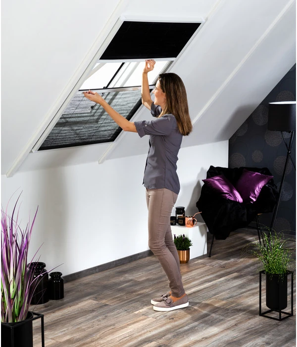 Wer Dachwohnungen oder Dachzimmer kennt, weiß um deren besondere Eigenschaften. Durch die gerade ausgerichtete Sonneneinstrahlung erhitzt diese den Raum besonders stark und beeinträchtigt das Wohlbefinden. Lüften lassen sich Dachzimmer häufig nur über die Dachfenster. Wenn Sie diese offen lassen, ist die Wahrscheinlichkeit hoch, dass Sie in kurzer Zeit Insekten zu Besuch haben. Das Hecht Kombi-Dachfenster-Plissee schafft für beide Fälle Abhilfe. Es schützt den Raum auf Wunsch effektiv vor Sonneneinstrahlung und hält Insekten davon ab, in den Raum zu kommen. Ihr Gewissen für die Umwelt kann dabei rein bleiben: der Blaue Engel besiegelt dem Produkt besonders umweltschonende Eigenschaften.