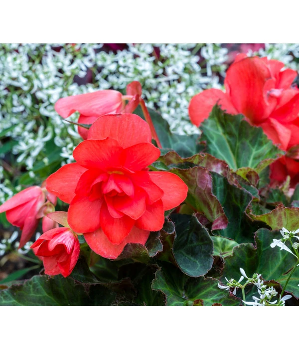 Neben den Eisbegonien sind auch die Knollenbegonien dankbare und pflegeleichte Dauerblüher. Die großen, gefüllten Blüten, sowie die schöne Kontrastwirkung der verschiedenen, leuchtenden Farben, zu dem tief dunkelgrünen Laub zeichnen diese Pflanzen aus. Wer die Bedürfnisse der Begonie berücksichtigt, erhält als Dank wunscherschöne Pflanzen, die bis zum ersten Frost ihre Blüten zeigen.