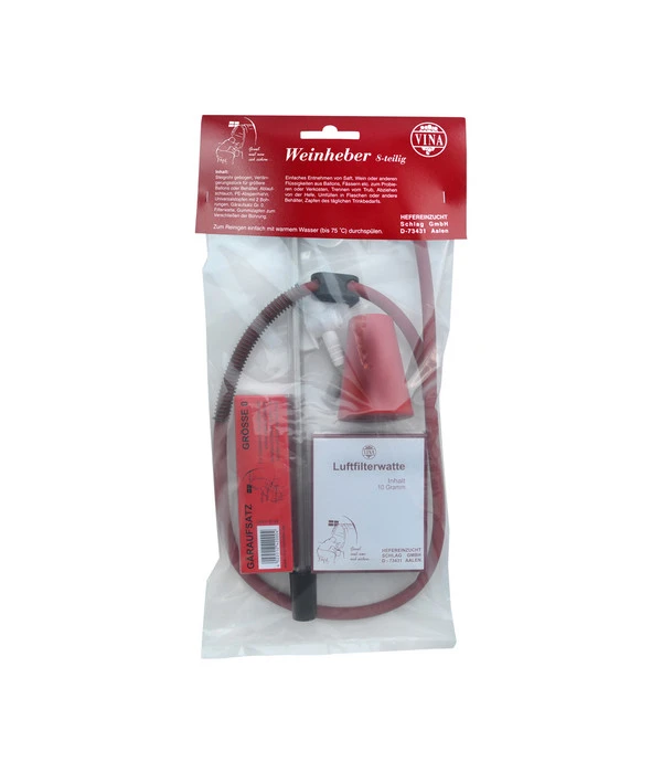Das Hobby der eigenen Weinbereitung ist sehr beliebt. Der VINA Weinheber als praktisches Erstausstattungspaket ist ein ideales Set für alle Einsteiger unter den Keltern. Mit dem Weinheber von VINA können Sie Proben Ihres Destillates aus den Behältern ohne Bodenauslauf ganz einfach entnehmen. Das Weinheber-Set aus Kunststoff erreicht dank des verstellbaren Ansaugrohrs eine Saughöhe von bis zu 65 cm. Im 8-teiligen Set enthalten sind Ansaugrohr, Auslauf mit Klemme, Absperrhahn, Filterwatte, Gäraufsatz, Gummizapfen und Universalstopfen. Die Kombination aus Auslaufhahn mit Klemme und der zusätzliche Absperrhahn sorgt für ein sicheres und hygienisches Verschließen.