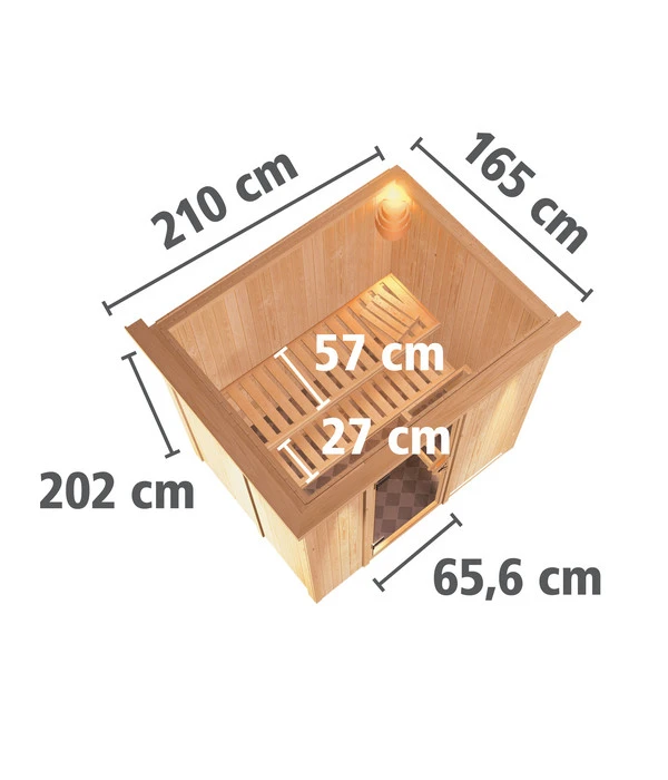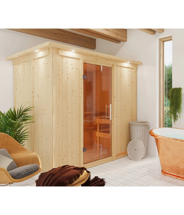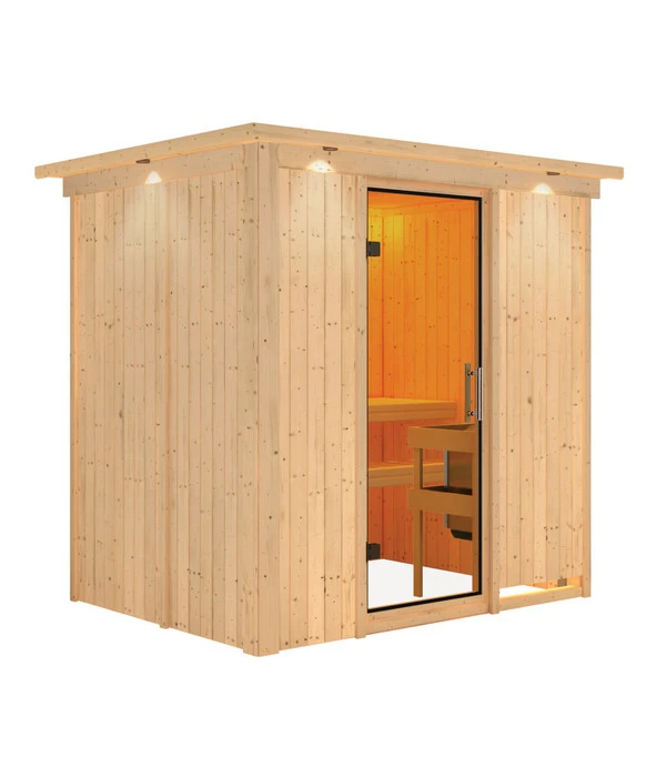 Hätten Sie jemals gedacht, dass sich Ihr Traum von der eigenen Sauna auf einer Grundfläche von 2,7 m² erfüllen lässt? Mit einer Wolff Finnhaus Innensauna de luxe Elaia klappt das! Und zwar mit allem Komfort. Sie werden also in Zukunft auf zwei bequemen Espenholz-Bänken nach allen Regeln der Kunst entspannen. Umgeben von urigen Wänden aus naturbelassener nordischer Fichte. Und wenn Sie sich auf Ihrer Espenholz-Liege der wohligen Hitze hingeben, genießen Sie den sanften Holzduft, blicken durch die bronzierte Glastür hinaus und lassen die Gedanken wandern. Selbstverständlich erhalten Sie Ihre kompakte Traumsauna in der für das Unternehmen Wolff Finnhaus typischen hohen Material- und Verarbeitungsqualität. Sämtliche Wand- und Dachelemente sind bereits mit Mineraldämmwolle gedämmt, damit die gesunde Saunahitze auch sicher drinnen bleibt. Tun Sie ihrem Immunsystem, Ihren Muskeln, Ihrem Kreislauf und natürlich auch Ihrer Seele etwas Gutes – mit einer kompakten Wolff Finnhaus Innensauna de luxe Elaia!